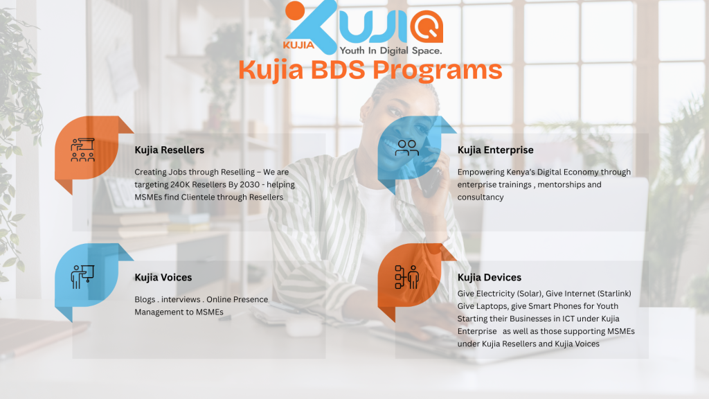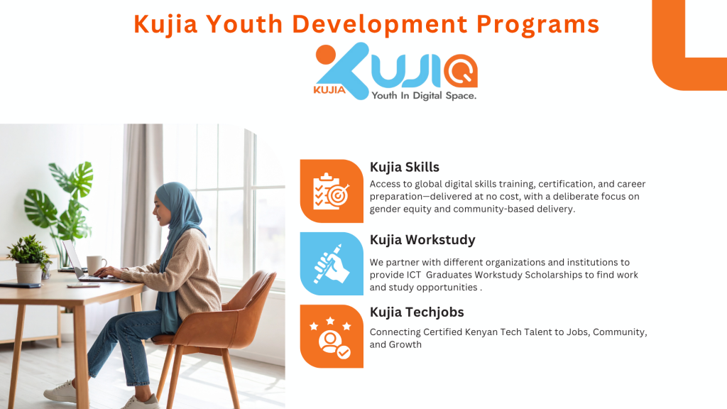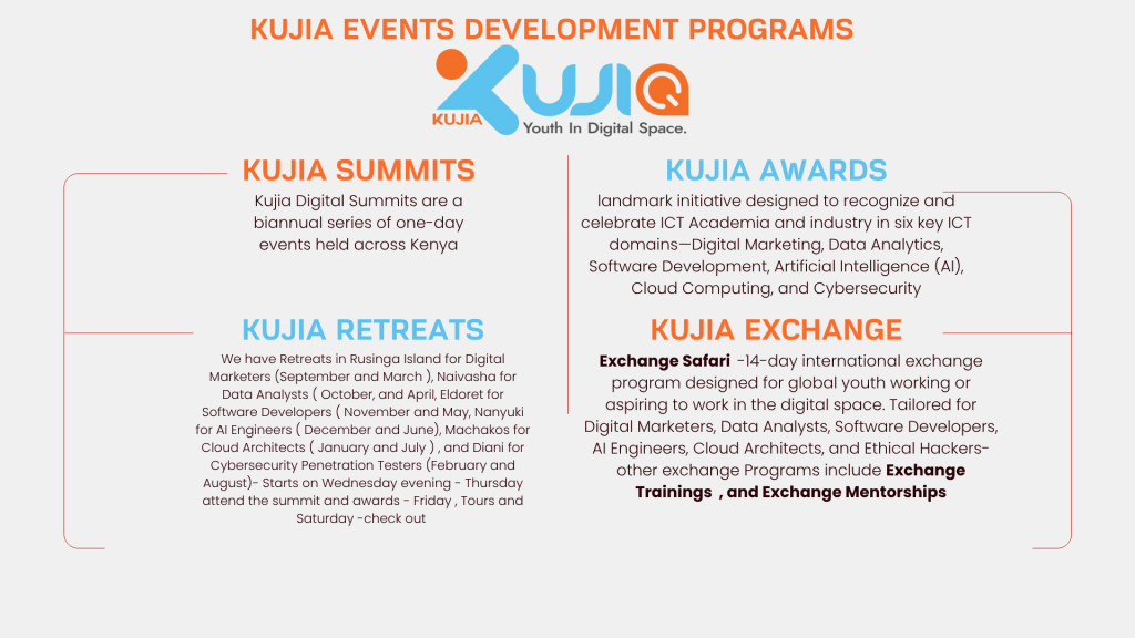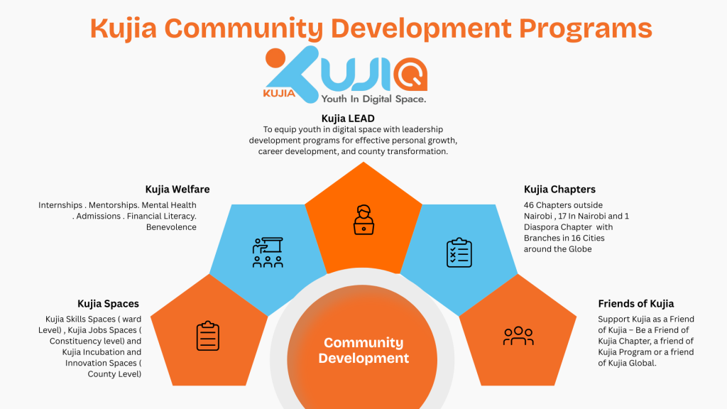 Kujia Kenya runs 16 comprehensive programs designed to equip youth aged 18–35 with global digital skills, access to jobs, and entrepreneurship opportunities. These include initiatives like Kujia Skills, Workstudy, and TechJobs to build technical capacity and connect youth with employment. Programs such as Kujia Resellers, Voices, Enterprise, and Devices support digital entrepreneurship and income generation. Others like Kujia Spaces, Welfare, Lead, and Chapters strengthen community engagement and youth development. The organization also hosts impactful experiences and recognition platforms through Kujia Summit, Awards, Retreats, and Exchange, while Friends of Kujia mobilizes global support. All programs are implemented through grassroots Chapters—46 in Kenyan counties, 17 in Nairobi constituencies, and 1 Diaspora Chapter with branches across 17 countries—ensuring both local relevance and global reach.